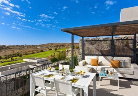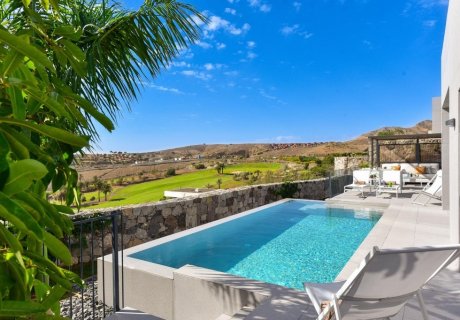Stylish 2-bedroom villa for 4 with heated pool, terrace, barbecue, and stunning golf course views, offering a serene luxury escape in Gran Canaria.