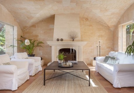 The villa is inspired by the works of Danish architect Jørn Utzon and is built with traditional island stones, including Mares and Santanyi stone, known for their color and texture. The ground floor houses a well-equipped kitchen, a spacious living area with two distinct lounges, and a dining room. Expansive windows provide panoramic views of the bay, sea, and the beautifully maintained gardens. Architectural details, geometric shapes, and vaulted ceilings give the home a distinctive and elegant character, creating a light-filled and inspiring environment.