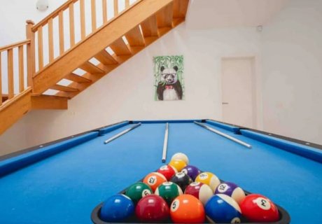 Inside, the accommodation features a modern fully equipped kitchen with dining space and direct access to the terrace. The living areas offer comfortable seating, high-speed fibre Wi-Fi, Netflix TV, a pool table, games and books, making it suitable for families with children of all ages. A dishwasher, washing machine, iron and ironing board provide convenience for longer stays.
