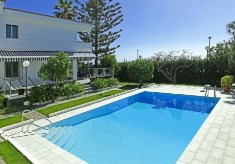 Beachfront holiday home in Playa del Ingles for 10 guests, with sea views, communal pool, private terrace, direct promenade access and parking for 4 cars.