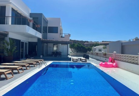 This spacious holiday villa is set in a peaceful residential neighbourhood in Costa Adeje, positioned at 350 metres altitude and offering wide panoramic views over rocky desert hills and the Atlantic Ocean. Guests can enjoy unforgettable sunsets from the large garden, the heated saltwater pool, the sun deck, or from one of the three outdoor terraces. The accommodation covers an impressive 450 m2 across three floors and comfortably hosts up to ten guests, making it ideal for families, groups of friends, or two families travelling together.