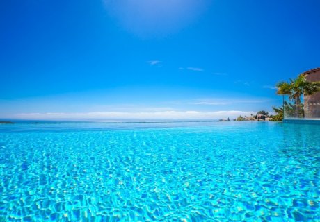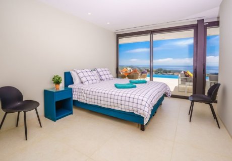 Luxury 5-bedroom villa for 10 guests with infinity pool, panoramic sea views, lift, BBQ terrace, welcome pack, beach towels and high-speed WiFi.