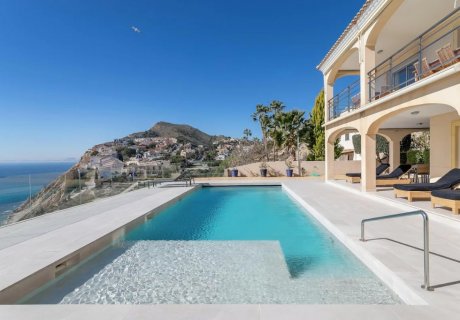 Modern 5-bedroom seafront villa for 10 guests with private pool, terraces, BBQ, fast WiFi and three-level layout near Cala La Merced and Campello Beach.