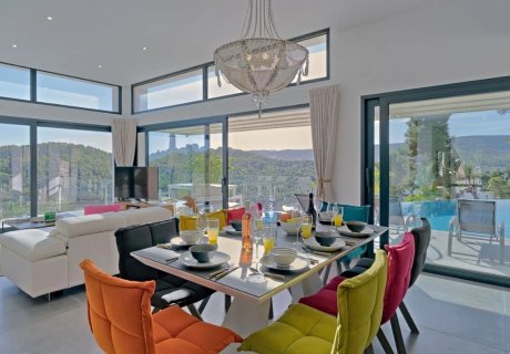 Modern 4-bedroom villa for 8 guests with heated saltwater pool, tennis court, panoramic views, BBQ terrace, A/C and WiFi near Arenal and Javea Port.