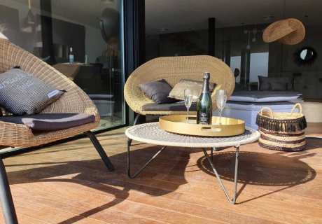 The highlight of the outdoor space is the heated mirror-edge pool (9 x 3.5 m) finished in grey/black tones and hanging over the garden with a panoramic sea backdrop. The pool is heated in the off-season and accompanied by an outdoor shower area, garden furniture, sun terraces and a plancha for relaxed meals outside. Both indoor and outdoor speakers offer Bluetooth connection for music around the house.