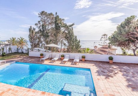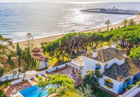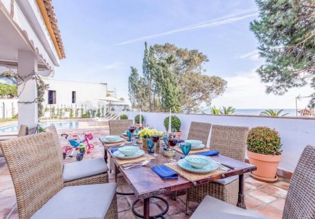 Elegant 5-bedroom villa just 50m from Cabopino Beach, near Calahonda, featuring a private pool, lush garden, and panoramic sea views near golf and marina.