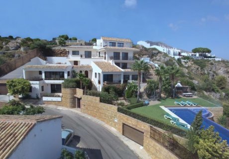 Spectacular 4-bedroom villa in Benalmádena Pueblo with panoramic Mediterranean views, infinity pool, jacuzzi, and elegant Andalusian design.