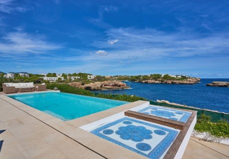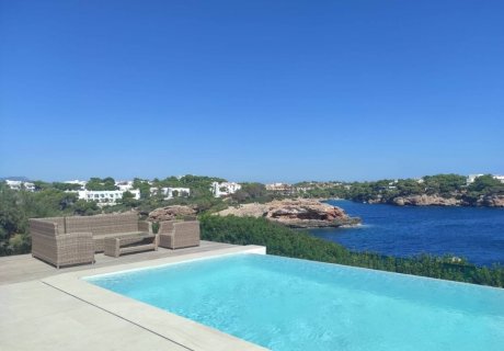 Modern seafront villa near Cala Esmeralda with infinity pool, direct sea access, private annex, panoramic views and space for up to 8 guests.