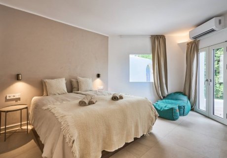 The interior has been completely refurbished in a modern style, with comfortable furnishings and neutral tones that create a warm and relaxed atmosphere. From the entrance, you access the living room, which enjoys open sea views. There is no TV in the main living area, allowing guests to fully appreciate the surroundings. Adjacent to the living room is the open-plan kitchen with a large dining table. Both spaces feature large sliding doors that open directly onto the terrace and pool area, creating a seamless indoor-outdoor flow. Next to the kitchen is a laundry area with access to the front garden.