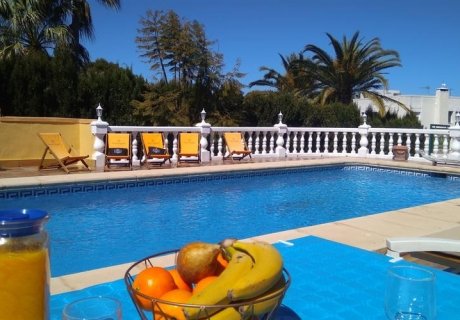 The villa is a single-storey property with sunny terraces and a backyard garden. It features 4 bedrooms, a fully equipped kitchen, and an equipped kitchenette area. The private pool includes 5 deck chairs, parasols, and a charcoal barbecue. Guests can enjoy table tennis and darts, while the villa complex also offers a picnic area for outdoor activities. Nearby amenities include Saladar supermarket and restaurant, and the stylish Hotel El Rodat.