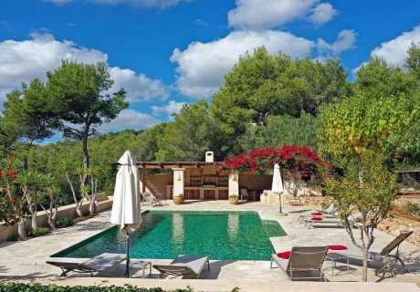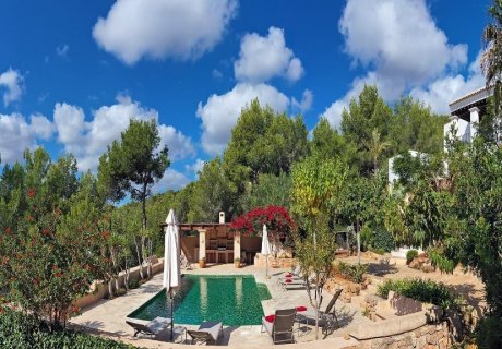 Situated near San Carlos, Ibiza, this charming finca-style villa accommodates up to 8 guests with 4 bedrooms and 3 bathrooms. Set on a quiet hill surrounded by nature, the property offers a serene holiday experience with lush gardens featuring large trees, mimosas, palms, and acacias. A large covered terrace with table and chairs provides a perfect spot for outdoor relaxation.
