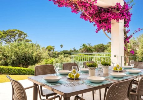 A stunning 4-bedroom retreat in Binibeca, Menorca, featuring a private heated pool, lush gardens, countryside views, and easy access to the beach.