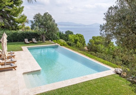 The open-plan living and dining area is filled with natural light and features glass doors opening onto the terrace and garden. The fully equipped kitchen comes with all modern appliances for effortless meal preparation. Two ground-floor bedrooms each include an en-suite bathroom and a dressing area, while the master suite on the first floor offers a separate living area, bedroom, dressing room, and a bathroom with a separate shower, along with a private terrace showcasing long sea views. Two additional bedrooms, each with their own en-suite bathroom, ensure comfort and privacy for all guests. Air-conditioning is available in every bedroom, and the property offers both covered and open terraces along with a well-kept lawned garden.