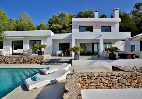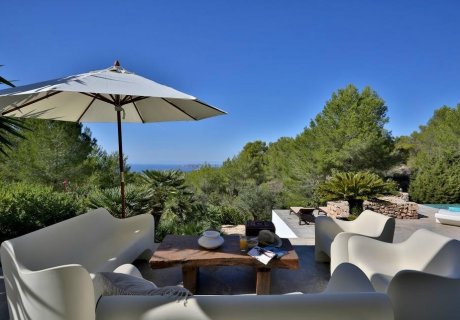 A luxury 4-bedroom retreat near Cala Tarida, offering stunning sea views, an infinity pool, chic chill-out areas, and magical sunset mome