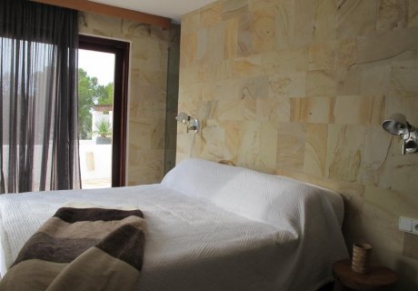 Designed by renowned architect Ralph Blakstad, the villa reflects the elegance of Ibiza's white-cube Moorish style, while incorporating design influences from Marrakech, Bali, and Italian minimalism. Thick 50 cm walls provide both insulation and character, complemented by enormous glass windows and sliding doors that open onto expansive roofed and open terraces furnished with lounge sofas and sun loungers.