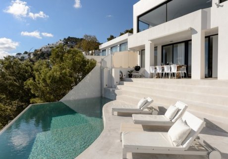 Living spaces feature large windows to maximize the stunning sea views, a top-of-the-range home cinema system, and plasma TVs throughout, including the kitchen. Extensive gardens and terraces provide multiple outdoor areas for relaxation, alfresco dining, or enjoying the spectacular sunsets. The infinity pool includes colored LED lighting, complemented by open-air showers and elegant Gandia-Blasco garden furniture.
