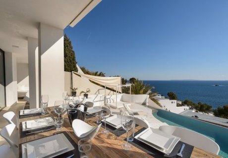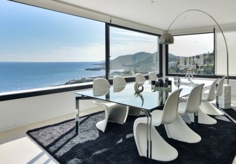 Exclusive 5-bedroom villa near Golf Roca Llisa, featuring designer interiors, infinity pool, and panoramic sea views. Close to Ibiza Town and Santa Eulalia.
