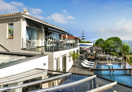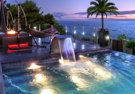 Outdoors, the villa's highlight is the heated infinity cascade pool with two power jets and massage steps, offering panoramic sea views. A glass-walled poolside cabana features a custom bar, barbecue, vintage jukebox, and surround sound system, creating the perfect setting for relaxing or evening poolside gatherings. Japanese-style manicured gardens with a Koi Pond, a deluxe hot tub, and a stage area provide additional spaces for leisure or events, alongside quiet spots for peaceful reflection. A fully equipped gymnasium allows for exercise while enjoying scenic views or watching TV.