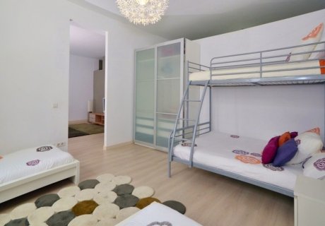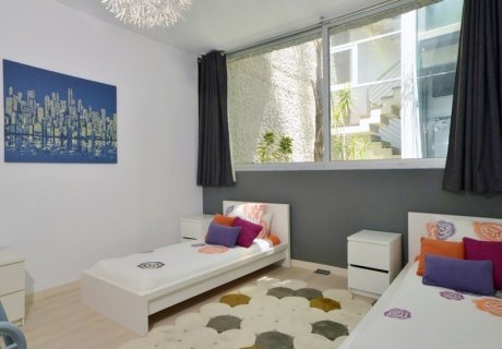 This three-level villa features five bedrooms and four bathrooms, ideal for families or groups seeking a sophisticated retreat away from the busy nightlife. The main floor welcomes you with a spacious living room opening directly onto the terrace and private swimming pool, alongside a separate dining area and a fully equipped modern kitchen. Two additional bedrooms and two bathrooms complete this level. Upstairs, the master suite includes an en-suite bathroom, a private terrace with panoramic views, a solarium, and a study. The basement offers an extra bedroom and bathroom, along with a garage accommodating up to three cars.