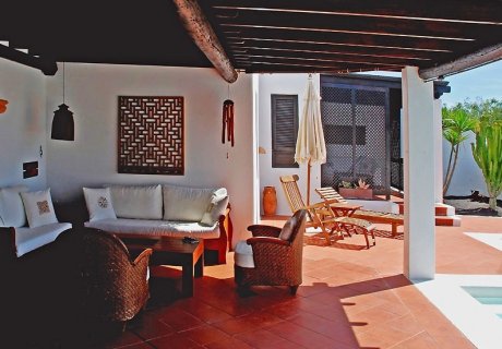 Outside, a covered patio furnished with stylish seating invites relaxation, while the garden features six sun loungers with parasols and a private heated pool measuring 10 m x 3.5 m. The barbecue area provides an ideal setting for alfresco dining, allowing you to enjoy the pleasant Lanzarote climate and scenic surroundings.