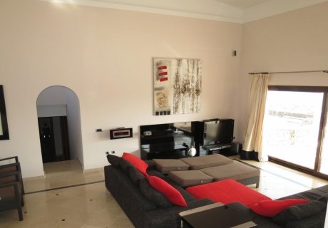 The villa features four spacious bedrooms and three bathrooms, providing ample comfort and privacy for families or groups. The open-plan living area is flooded with natural light through a large picture window, creating a bright and welcoming atmosphere. The fully equipped kitchen includes all modern appliances, while a utility room and guest WC add convenience. A double garage and expansive gardens and terraces provide additional space and functionality.