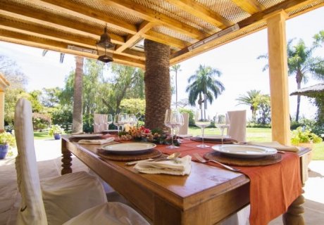 The main villa features a grand lounge with a fireplace, dining room, fully equipped kitchen, library, office, and a master bedroom with dressing room and en-suite bathroom. Additional accommodations include a guest cottage with 2 bedrooms, 2 bathrooms, a modern kitchen, lounge, dining area, covered terrace, and garden, as well as two independent guest apartments offering further bedrooms, bathrooms, kitchens, lounges, and terraces. All units are equipped with modern technology for comfort and convenience.