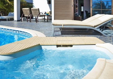 Step outside to the private pool with jacuzzi, surrounded by a garden and terrace fitted with seating, an awning, and four sun loungers-ideal for sunbathing and outdoor relaxation.