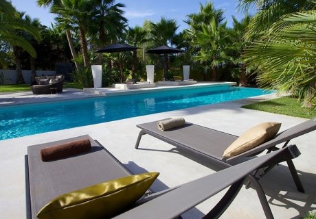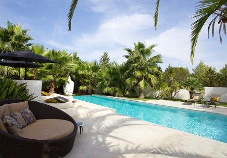 This chic holiday villa in San Antonio, Ibiza, offers 5 en-suite bedrooms, a 20m lap pool, and vibrant, palm-filled grounds, ideal for a stylish getaway.