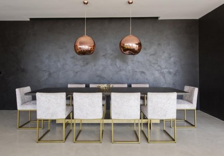 Inside, the home exudes a sophisticated, James Bond-inspired aesthetic. Black walls, contemporary art, and designer furnishings from Casa Desus, Talenti, Tom Dixon, and Soho House create a bold yet balanced style. The professional-grade kitchen is equipped with a teppanyaki, sous-vide appliance, steam oven, and a breakfast area, making meal preparation effortless. The interior flows effortlessly from the living room, with comfortable sofas and satellite TV, to a formal dining area for 10, all with access to the terraces.