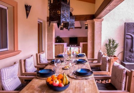 - Covered terrace with seating and dining area