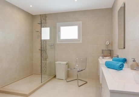 Six elegantly designed bedrooms are distributed across the property. The master suite includes a double bed, garden access, and an en-suite bathroom with walk-in shower. Five additional bedrooms can be configured as doubles or twins, with two more en-suite bathrooms and one shared bathroom, all featuring walk-in showers. The master and other ground-floor bedrooms offer direct access to the garden.