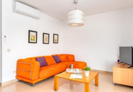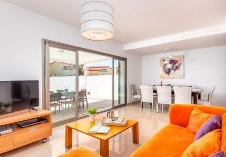 The villa's interior is bright and welcoming, featuring a fresh white décor and quality furnishings. The open-plan living and dining area provides a comfortable space for relaxation and socializing, with plush orange-accented sofas, a large dining table for eight, and a flatscreen TV with DVD player. The fully equipped kitchen includes an integrated oven and hob, microwave, coffee machine, dishwasher, and all necessary cookware and utensils for preparing delicious meals.