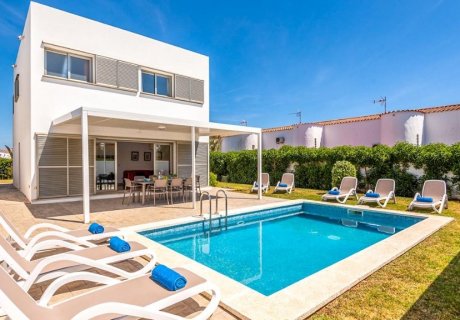 This modern holiday villa in Cala en Bosch, Menorca offers a private pool, proximity to beaches, and accommodates up to 8 guests, ideal for a family holiday.