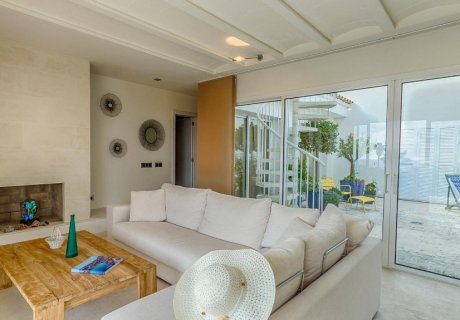 Designed on a single level, the villa provides easy access throughout, making it perfect for families with young children, elderly guests, or those with limited mobility. The bright living and dining area is inviting and comfortable, furnished with a plush cream corner sofa, decorative fireplace, and a flatscreen TV. Large sliding glass doors fill the space with natural light and open onto the terrace, offering indoor-outdoor living with views over the pool and sea.