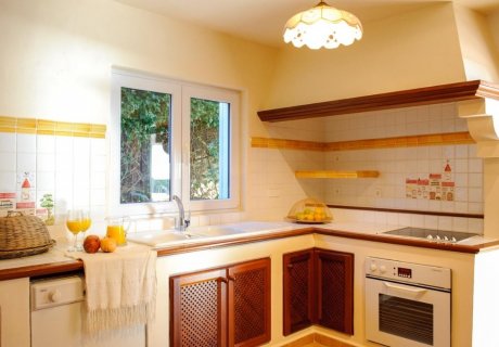 The ground floor comprises a bright and welcoming living area with comfortable seating, a TV, and direct access to a terrace, perfect for soaking in the views. The open-plan dining space accommodates six guests and also opens onto the terrace, creating a seamless indoor-outdoor experience. The well-equipped kitchen features a ceramic glass cooktop, microwave, toaster, dishwasher, electric oven, kettle, fridge/freezer, and an electric coffee machine, providing everything needed for preparing meals with ease.