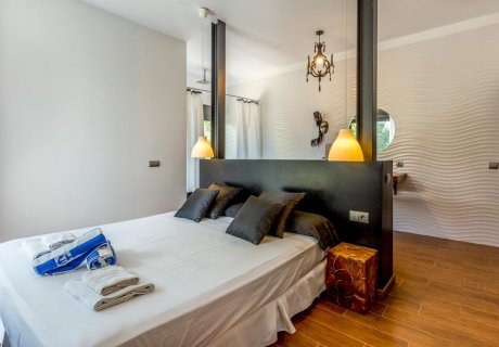 The villa is ideally located for exploring Ibiza's stunning beaches and attractions. Cala Tarida and Cala Moli are just a short drive away, offering calm waters and sandy shores suitable for swimming, sunbathing, and snorkeling. Ibiza Town, with its vibrant nightlife, world-class dining, and historic Dalt Vila, is approximately 20 minutes by car. Salinas and Es Cavallet beaches provide secluded spots and trendy beach clubs. Nearby local shops and restaurants in San Jose offer authentic Ibizan cuisine and charming shopping experiences.
