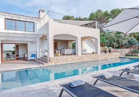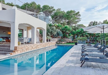 The villa is set in lush gardens full of palms, tropical plants, and vibrant flowers, enhancing the sense of privacy and serenity. Cala Moli beach, a charming pebbly cove, is just 1.8 kilometres away, perfect for daytime dining or sunset strolls. The sandy beaches of Cala Tarida and Cala Vadella are only a short drive from the property, with Cala Codolar, Cala Conta, and Cala Bassa also within easy reach.