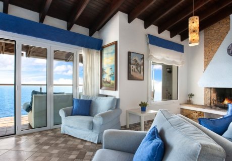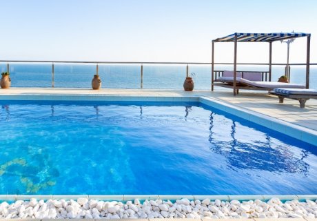 On the first floor, a heated indoor pool, jacuzzi, and sauna create a private wellness retreat. Three of the double bedrooms open onto a terrace with panoramic sea views, offering serene morning vistas. The top floor contains two additional double bedrooms, each with an en-suite bathroom and terrace access, enhancing the villa's charm and providing private retreat spaces for guests.