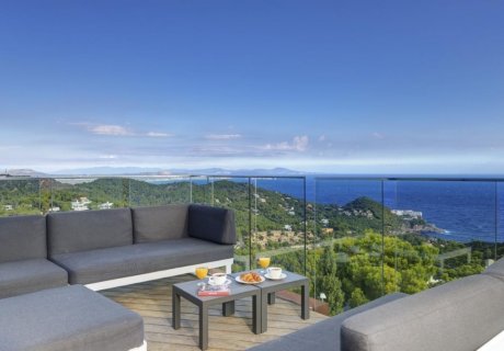 The villa's outdoor areas are perfect for soaking up the sun on luxurious loungers, enjoying meals al fresco, or relaxing with a book while admiring panoramic views of the sea and surrounding area. The open-plan layout is ideal for families, though supervision is recommended around the terrace and pool. A cot and high-chair are available for guests with young children.