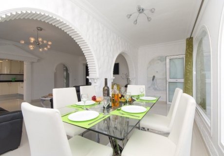 The main villa is accessed via 10 steps from the road and showcases elegant white marble flooring throughout. On the first level, the kitchen is fully equipped with an oven/hob, fridge/freezer, dishwasher, washing machine, microwave, toaster, and kettle, all set against granite work surfaces. Patio doors open to the pool terrace. The lounge offers 2- and 3-seater leather sofas, additional chairs, and a flat-screen TV with UK channels. The dining area features a glass table with white leather chairs, overlooking the pool and the stunning panoramic views. A fully tiled family bathroom with a walk-in shower is also on this level, with doors leading to the pool terrace and Bedroom 3.