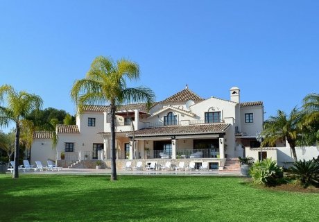 Luxury 9-bedroom villa in Cancelada, Marbella with stunning golf and sea views, ideal for large groups.