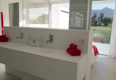 - Middle Floor: Bedroom 1 - King bed, en-suite bathroom with stand-alone shower and two sinks, walk-in closet, direct access to terrace and pool with golf course views