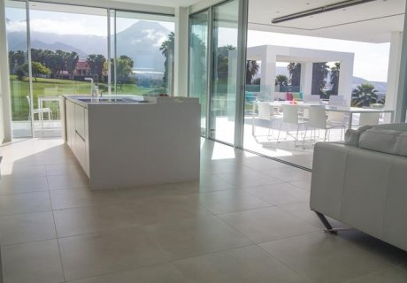 The property is set in an exclusive residential area surrounded by a golf course and just minutes from the beach. Guests enter via a gated drive leading to several levels of sunny terraces with chaise longues, a terrace lounge area, and a mini soccer field. The outdoor dining area and barbecue provide the perfect setting for alfresco meals, while the infinity pool offers a serene retreat for relaxation.