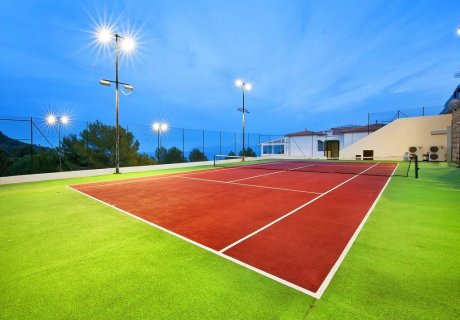 This luxury holiday villa in Mallorca offers multiple pools, sports facilities and breathtaking sea views, ideal for exclusive island rentals.