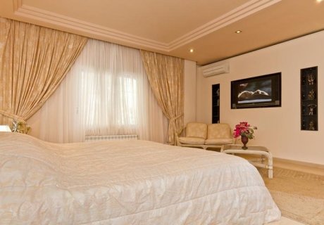 The villa features eight spacious bedrooms and eight bathrooms, including two master suites with extra-large beds and spectacular views. Additional bedrooms offer a mix of double and twin configurations, all equipped with air conditioning for optimal comfort. Bathrooms are designed with luxury in mind, including high-quality marble finishes, large showers, and even a TV in the master bathroom mirror.