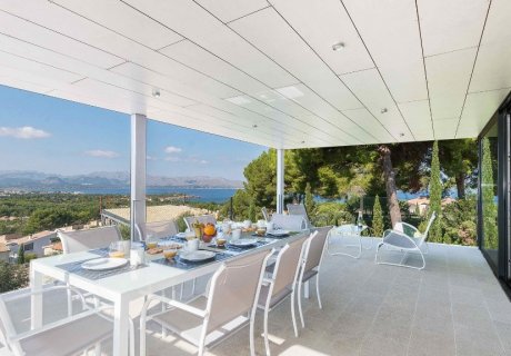 Modern villa in Alcudia, Majorca, with sea and mountain views, with 4 double bedrooms. Swimming pool, terraces, barbecue and close to beaches.