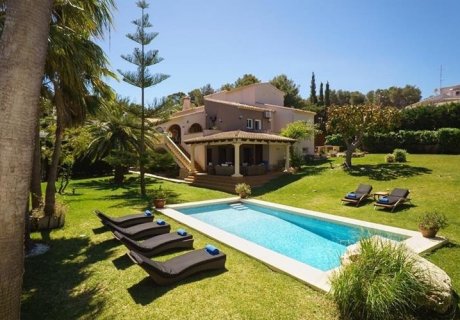 Surrounded by gardens, this 6-bedroom luxury retreat in Javea features a private pool and panoramic mountain views, ideal for upscale holiday rentals.