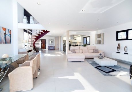 Upstairs, accessed via a sculptural staircase, are three additional double bedrooms, including one en-suite with a whirlpool bath and private terrace overlooking the sea. All bedrooms include air conditioning and forced-air heating, ensuring comfort throughout the year.
