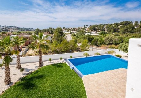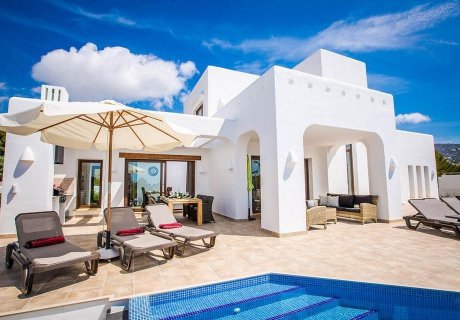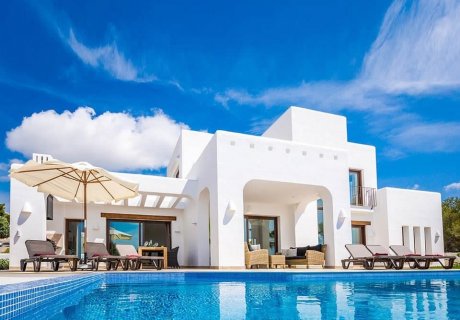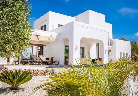 Ibizan-style holiday home with 3 bedrooms, sea views and a beautiful pool, offering modern comfort just 20 minutes from the beach.