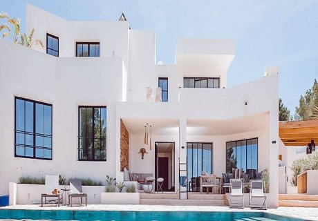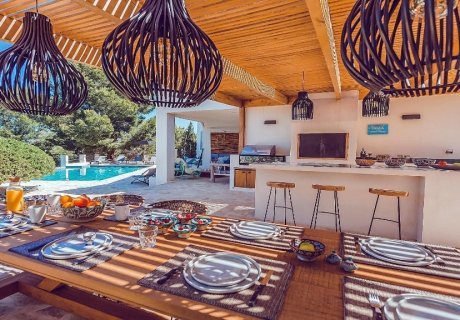 This exquisite property near Cala Tarida, Ibiza, offers an infinity pool, panoramic sea views, and extensive family-friendly amenities. Perfect for groups or families seeking a stylish and memorable island escape, book your unforgettable holiday in Spain today!